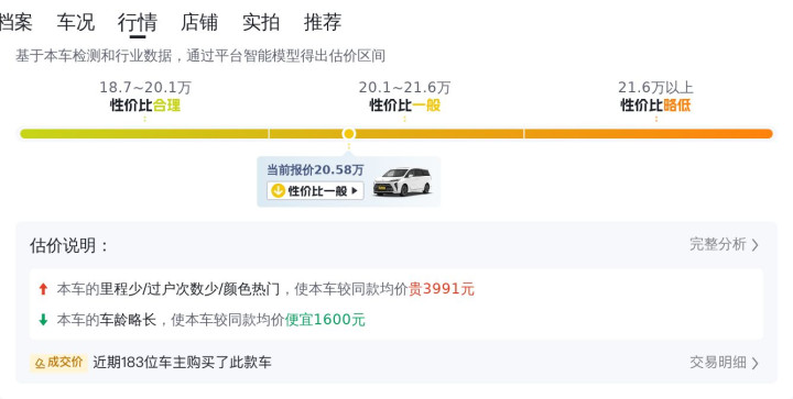 根据懂车帝的数据,这辆别克GL8 2020款 ES陆尊 653T 尊享型的二手车报价为20.58万元。在过去的90天内,该车的价格经历了两次降价,累计降价幅度为0.41万元,显示出卖家对于快速出售的决心。这一价格在当前的二手车市场中具有一定的竞争力。
